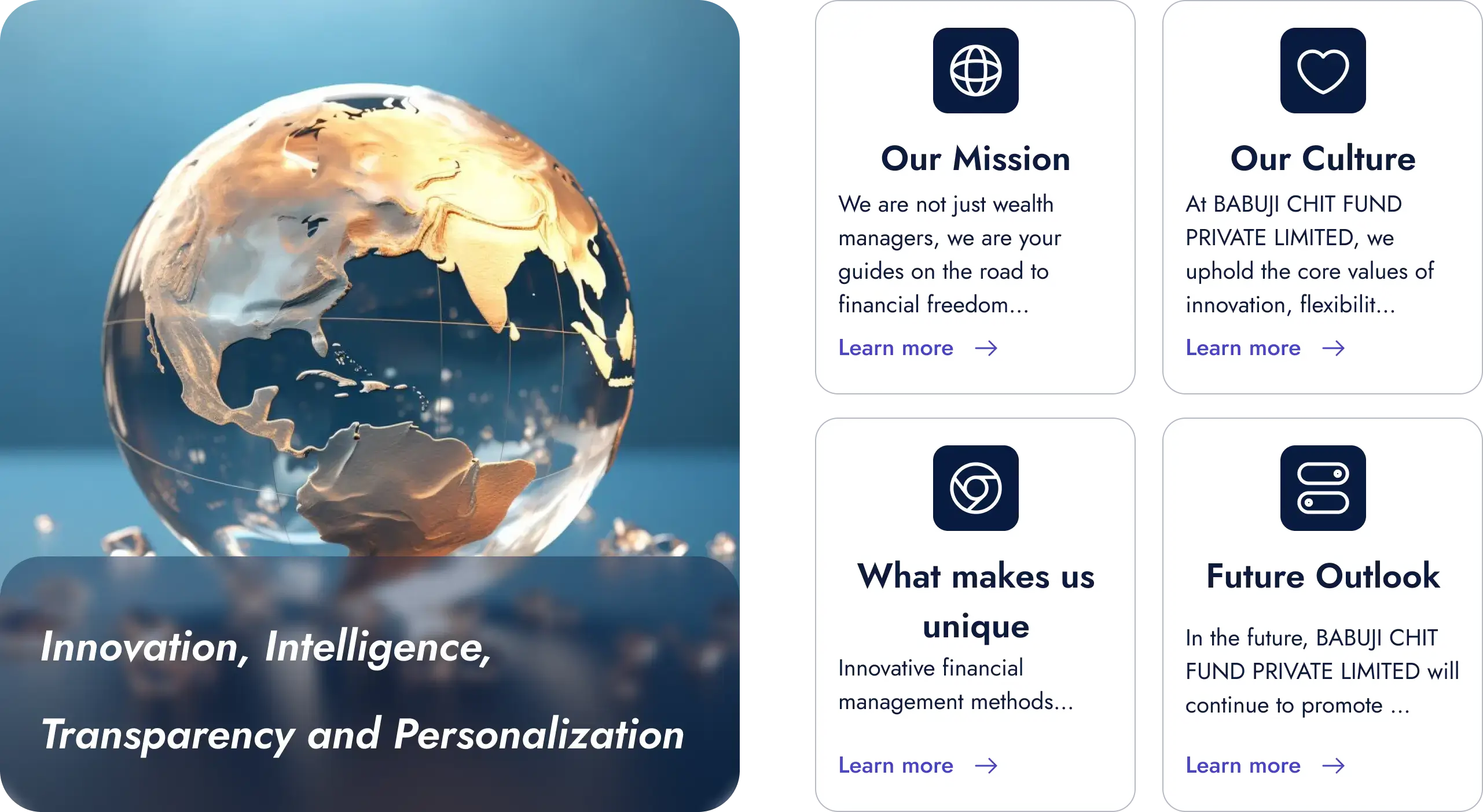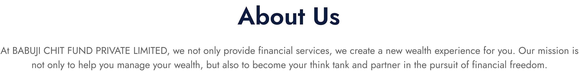 BABUJI CHIT FUND PRIVATE LIMITED is not only a financial management company, but also your "wealth advisor partner", committed to helping every customer achieve more flexible and free wealth management and life planning through innovative financial concepts, transparent investment